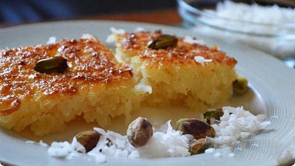- صبي الشربات الدافئ على البسيمة الساخنة بمجرد خروجها من الفرن حتى تكون بسيمة ناعمة ومرملة.