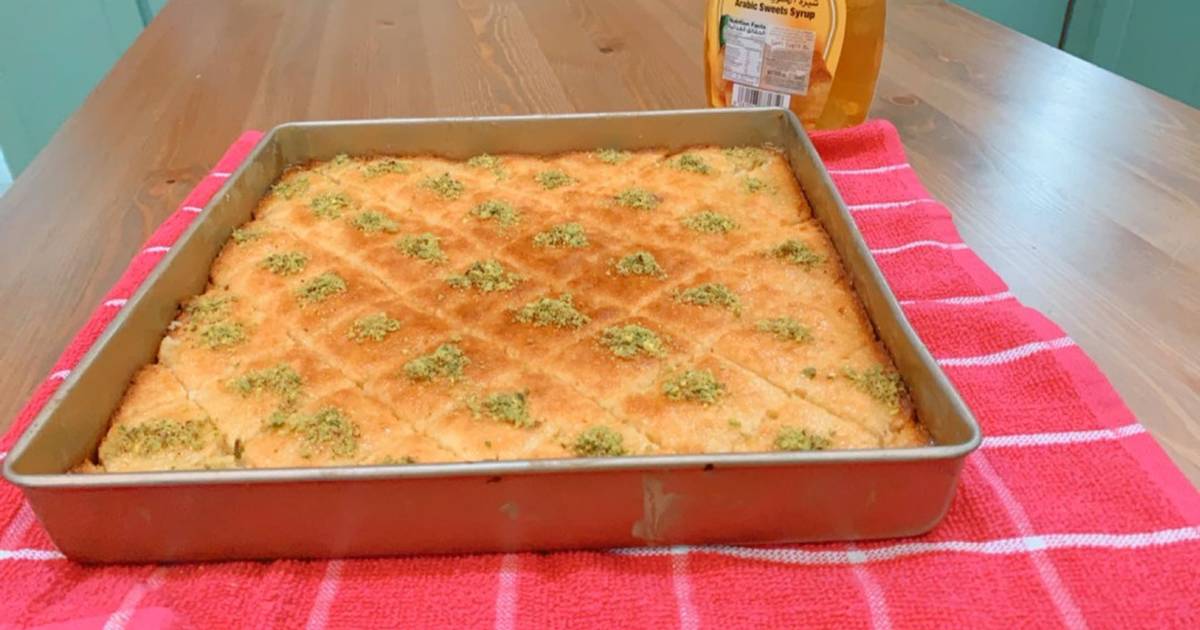 - جهزي صينية مدهونة سمنة ومرشوشة بالسميد وافردي فيها خليط البسيمة.