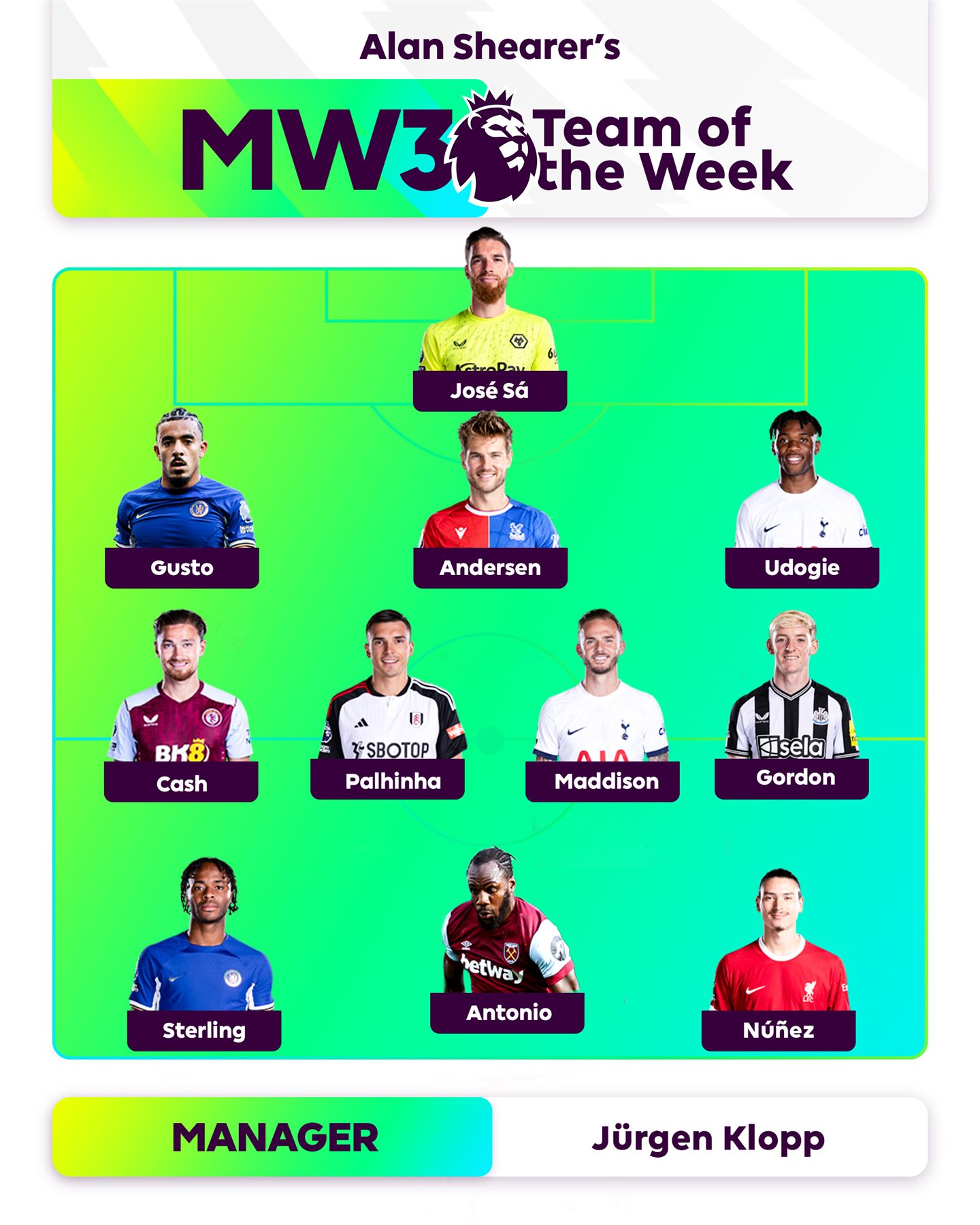 خط الوسط: أنتوني جوردون (نيوكاسل يونايتد)، جيمس ماديسون (توتنهام)، جواو بالينيا (فولهام)، ماتي كاش (أستون فيلا).