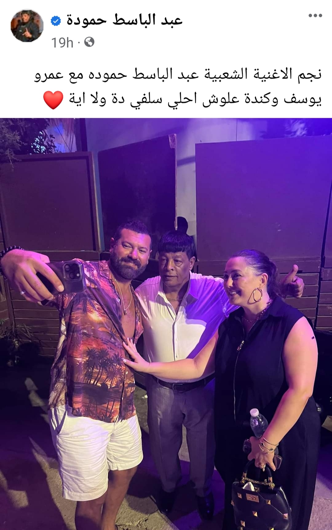 ونشر المطرب عبد الباسط حموده صورة جمعته مع كنده علوش وعمرو يوسف وعلق عليها "نجم الأغنية الشعبية عبدالباسط حموده مع عمرو يوسف وكنده علوش، احلى سيلفى ده ولا ايه".
