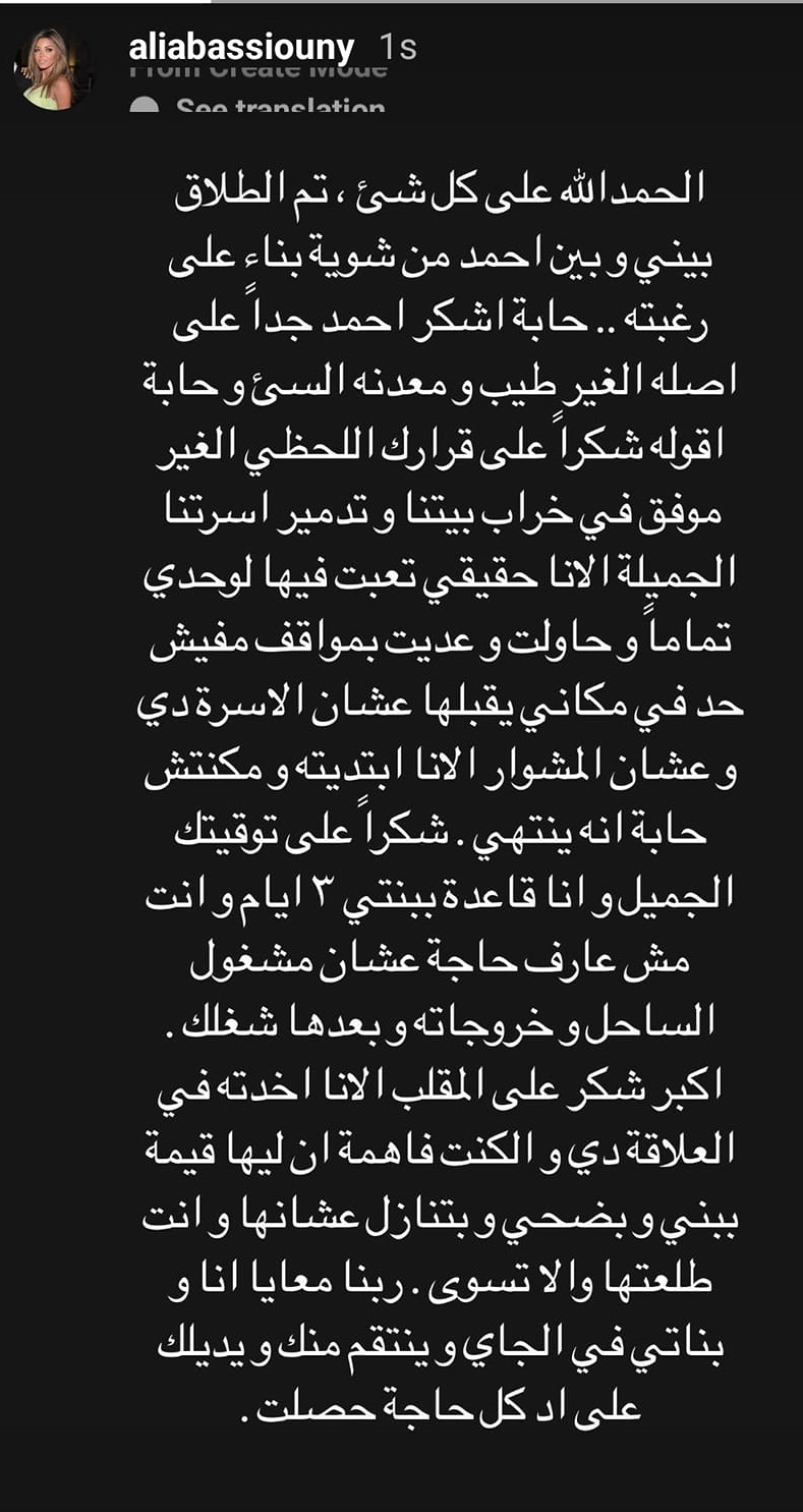 وقالت علياء بسيوني: "الحمد لله على كل شيء.. تم الطلاق بيني وبين أحمد من شوية بناء على رغبته.. حابة أشكر أحمد جدا على أصله الغير طيب ومعدنه السيء.. وحابة أقوله شكرا على قرارك اللحظي الغير موفق في خراب بيتنا وتدمير أسرتنا".