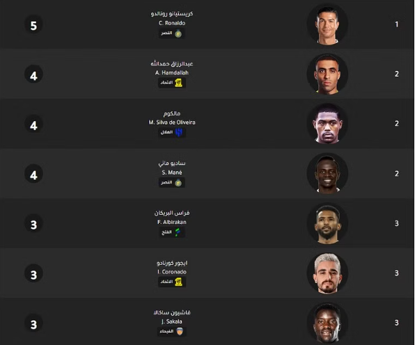 بهذه الثنائية، تربع رونالدو على صدارة جدول ترتيب هدافي الدوري السعودي برصيد 5 أهداف، ويأتي خلفه المغربي عبد الرزاق حمد الله، نجم الاتحاد، برصيد 4 أهداف.