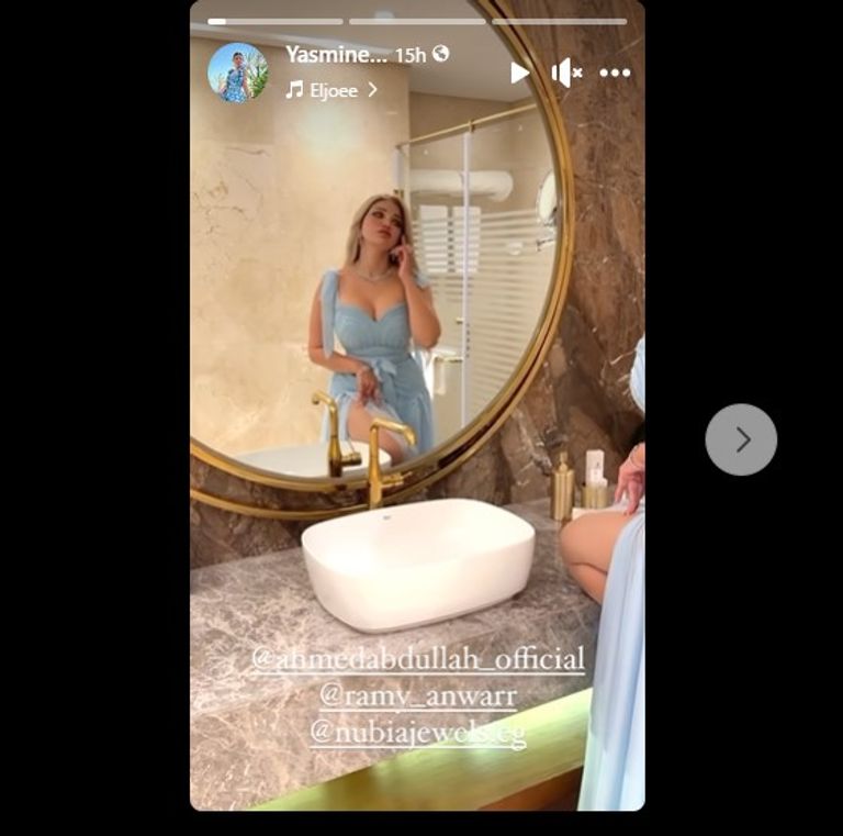 وتألقت ياسمين بفستان فضفاض باللون اللبني المطرز، ومكشوف من الصدر والفخذ، وتركت خصلات شعرها الأشقر ينساب على كتفيها، وأكملت إطلالتها ببعض لمسات المكياج غير المتكلف.
