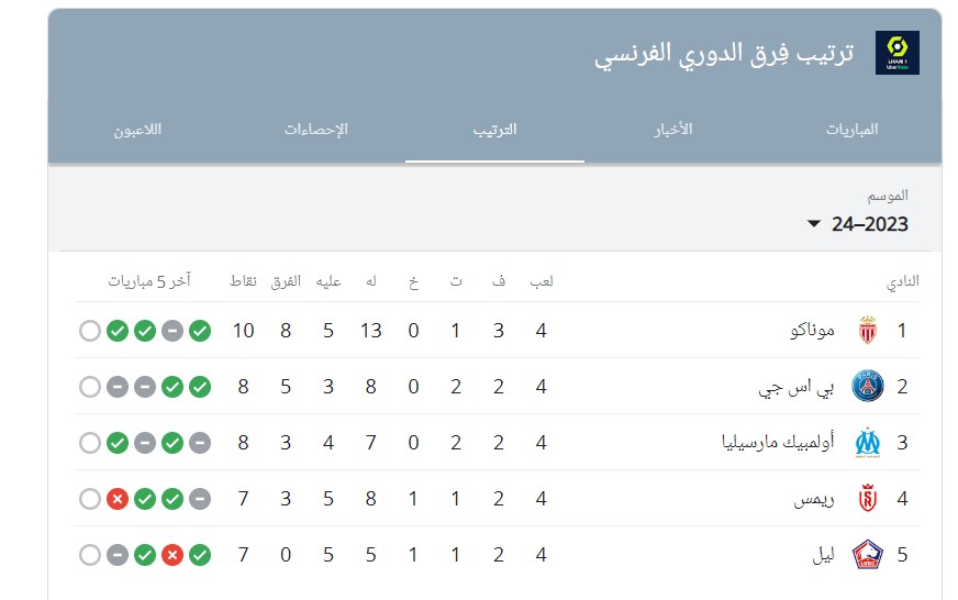 ترتيب الدورى الفرنسى