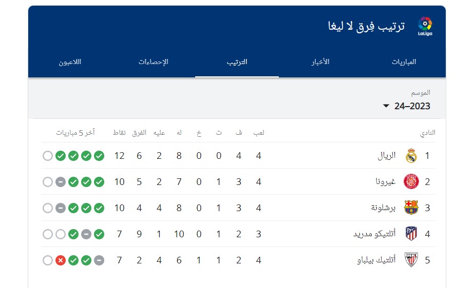 ترتيب الدوري الاسباني.. وتصدر نادي ريال مدريد جدول ترتيب الدوري الإسباني برصيد 12 نقطة جمعها من الفوز في المباريات الأربع الماضية وتسجيل 8 أهداف وتلقي 2.