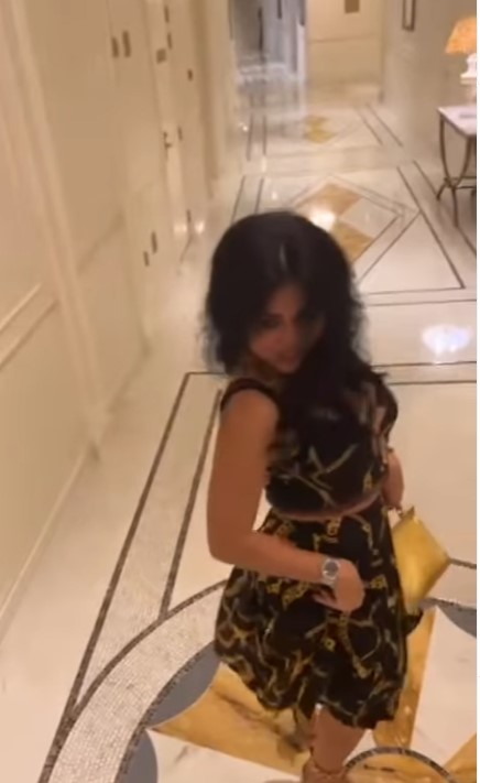 ولفتت رانيا يوسف، الأنظار في الفيديو بإطلالة جريئة، حيث ارتدت توب قصير كشف بطنها وذا أكمام مكشوفة باللون الأسود المزين بالرسومات ذات اللون الذهبي مع تنورة بنفس النقشة.