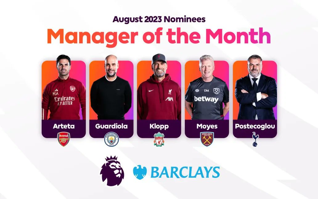 وجاء على رأس القائمة، الإسباني بيب جوارديولا مدرب مانشستر سيتي، ومواطنه مايكل أرتيتا مدرب أرسنال، مع الألماني يورجن كلوب مدرب ليفربول، وديفيد مويس المدير الفني لفريق وست هام، وأنجلي بوستيكوجلو مدرب توتنهام هوتسبير.