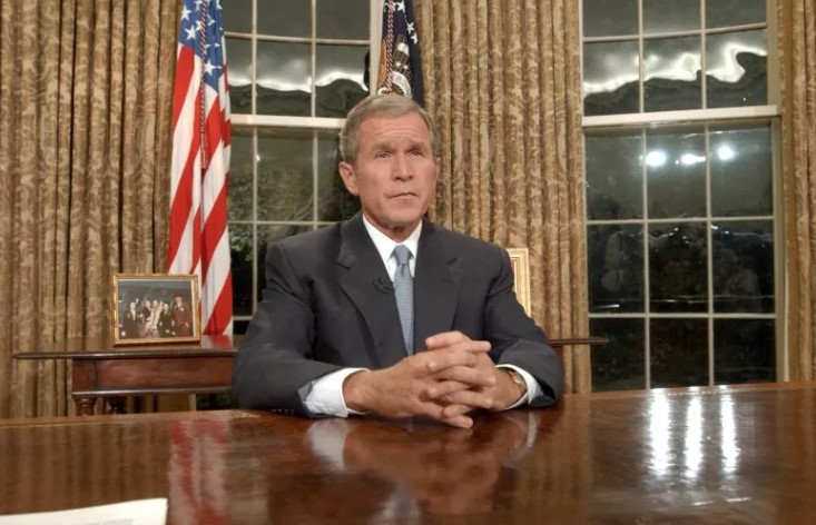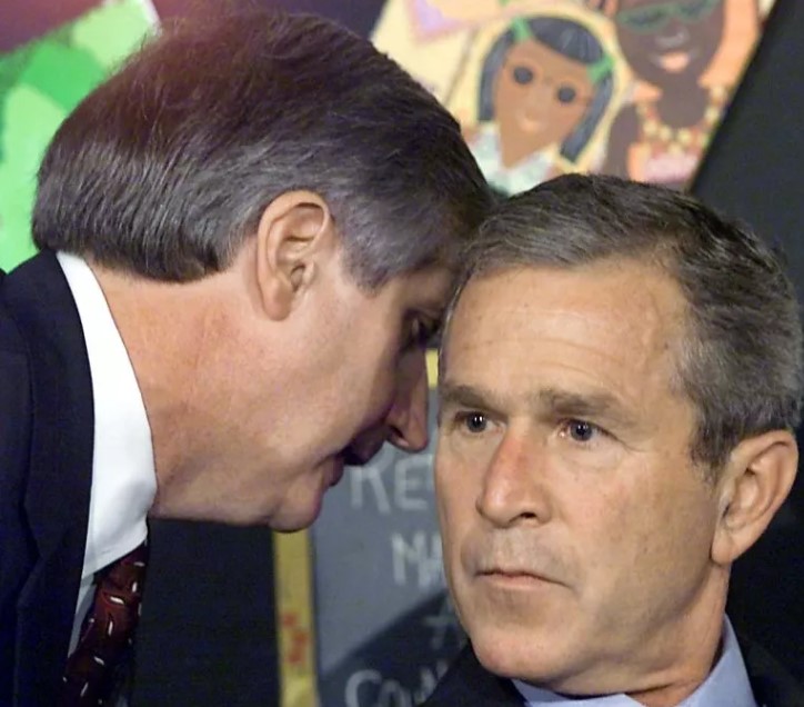 عندما وقعت الهجمات، كان الرئيس الأمريكى حينئذ جورج دبليو بوش فى مدرسة إيما بوكر البتدائية فى ولاية فلوريدا للقاء الأطفال، وأثناء وجوده داخل احد الفصول، تم إبلاغه بأن طائرة ضربت مركز التجارة العالمى، وكان يعتقد فى البداية أنه حادث، قبل أن يبلغ رئيس موظفي البيت الأبيض أندرو كارد بعد دقائق بضربة الطائرة الثانية وأخبره بان أمريكا تتعرض لهجوم.
