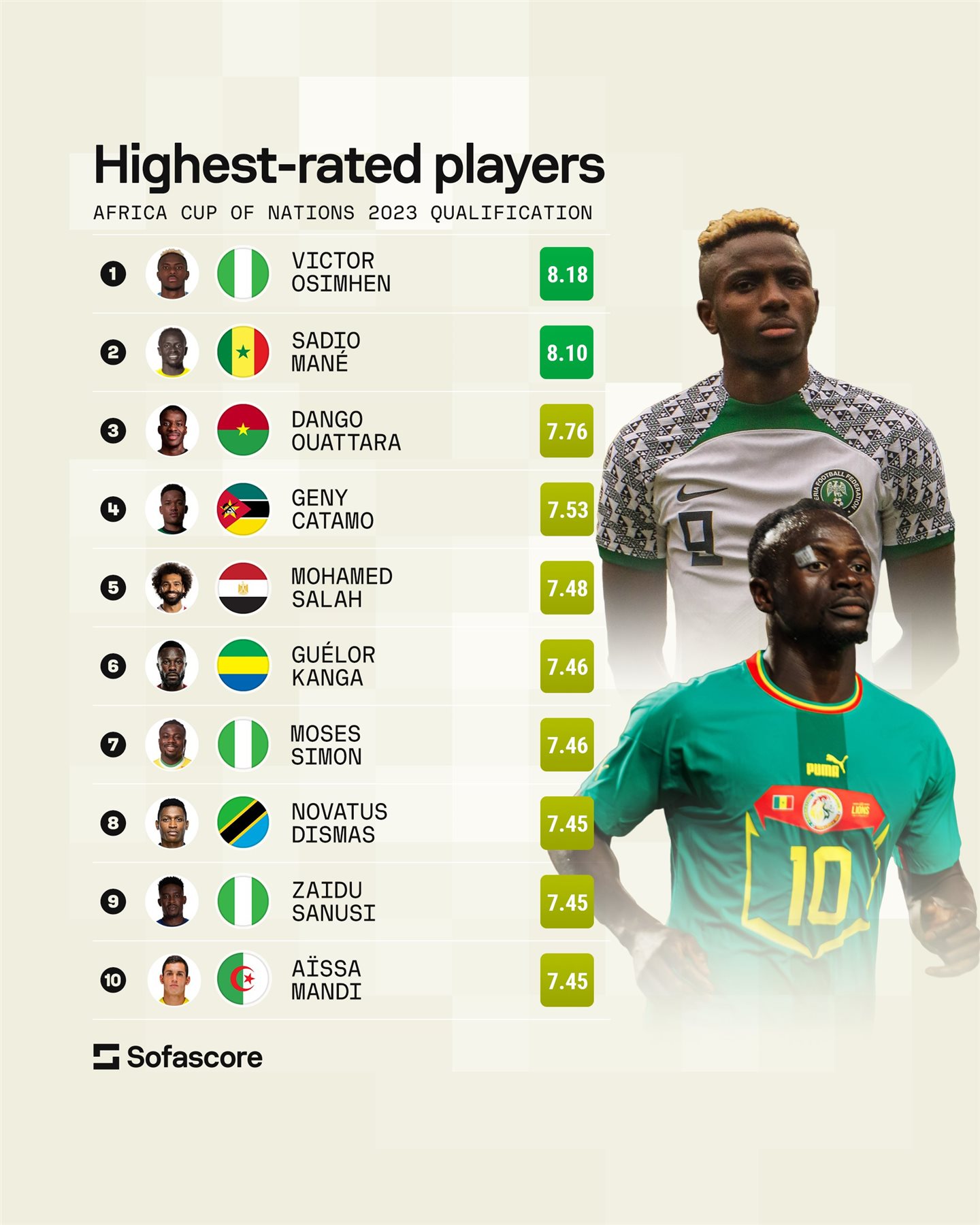 وكشفت شبكة "سوفا سكور" العالمية المتخصصة في إحصائيات وأرقام كرة القدم، عن قائمة أفضل اللاعبين في التصفيات المؤهلة لبطولة كأس الأمم الإفريقية، والتي تصدرها المهاجم النيجيري فيكتور أوسيمين لاعب نابولي الإيطالي.