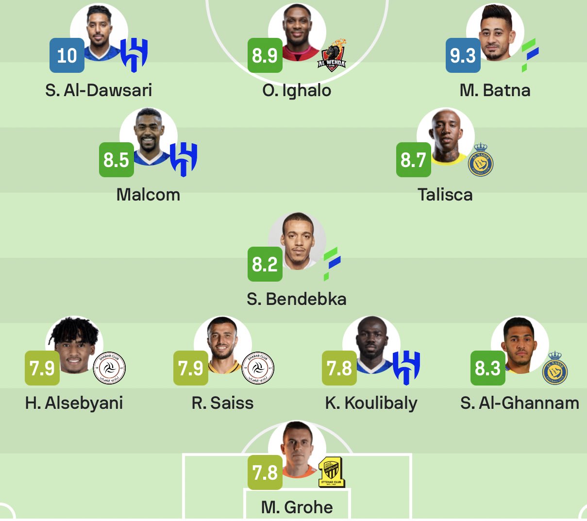 خط الوسط: سفيان بن دبكة "الفتح" - تاليسكا "النصر" - مالكوم "الهلال".