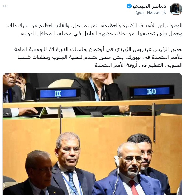 عقب الدكتور ناصر الخبجي رئيس وفد المجلس الانتقالي الجنوبي التفاوضي، على أهمية حضور اللواء عيدروس الزبيدي في اجتماع جلسات الدورة 78 للجمعية العامة للأمم المتحدة في نيويورك.