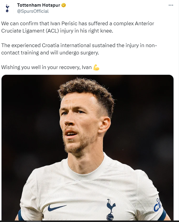 ونشر توتنهام بيان رسمي عبر موقعه وحسابه على "توتير"، اليوم الأربعاء، جاء فيه: "يمكننا أن نؤكد أن إيفان بيريسيتش تعرض لإصابة معقدة في الرباط الصليبي الأمامي (ACL) في ركبته اليمنى".