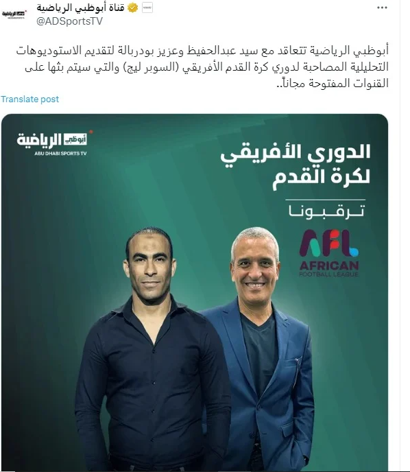 كما أعلنت أيضًا تعاقدها مع عزيز بودربالة النجم المغربي السابق، لمعاونة سيد عبد الحفيظ في تقديم الاستوديو.