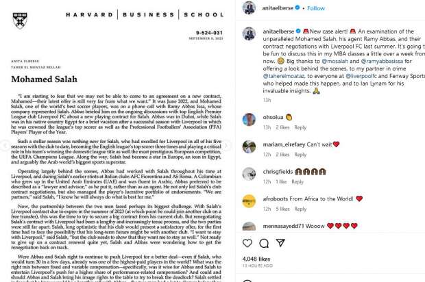 قالت أنيتا إلبيرس الأستاذة بجامعة هارفارد والمشرفة على الدراسة: "جاءت الدراسة للمنفرد محمد صلاح ووكيله رامي عباس، ومفاوضات تجديد العقد مع نادي ليفربول الصيف الماضي".