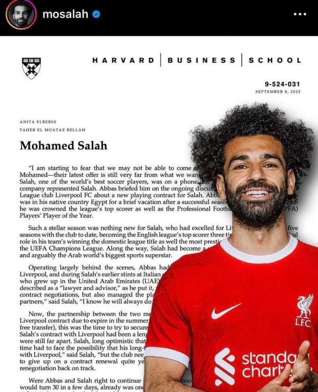 ونشر محمد صلاح عبر حساباته الرسمية على مواقع التواصل الاجتماعي، دراسة بحثية أجرتها جامعة هارفارد الأمريكة للأعمال، وتحديدًا الطالب طاهر المعتز بالله تحت إشراف الدكتورة أنيتا إلبيرس، كشفت تفاصيل مفاوضاته الأخيرة مع ليفربول لتجديد عقده مع الريدز.