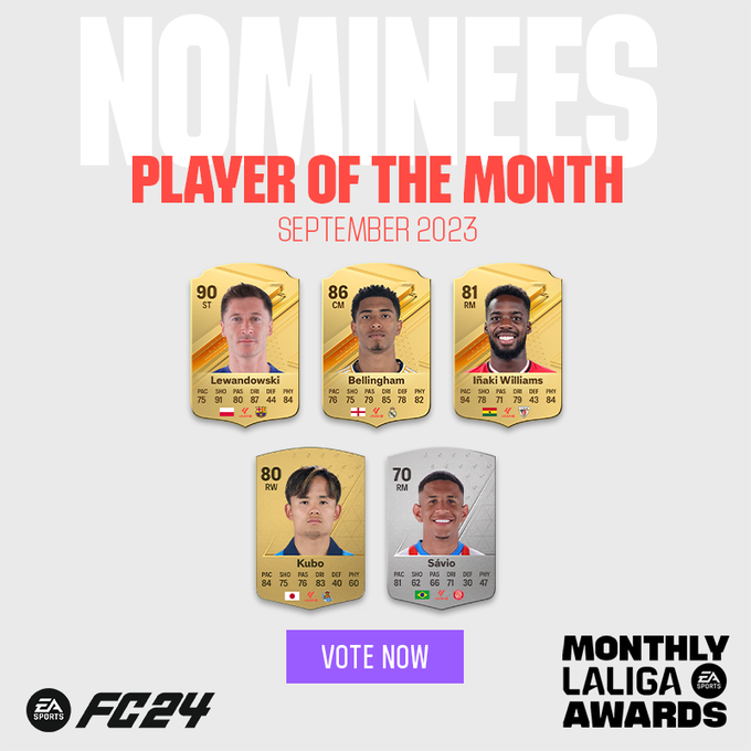 وضمت أسماء اللاعبين المرشحين كلا من: تاكيفوسا كوبو لاعب وسط ريال سوسيداد، سافينيو جناح فريق جيرونا، نيكو ويليامز نجم أتلتيك بيلباو، بالإضافة إلى روبرت ليفاندوفسكي وجود بيلينجهام.