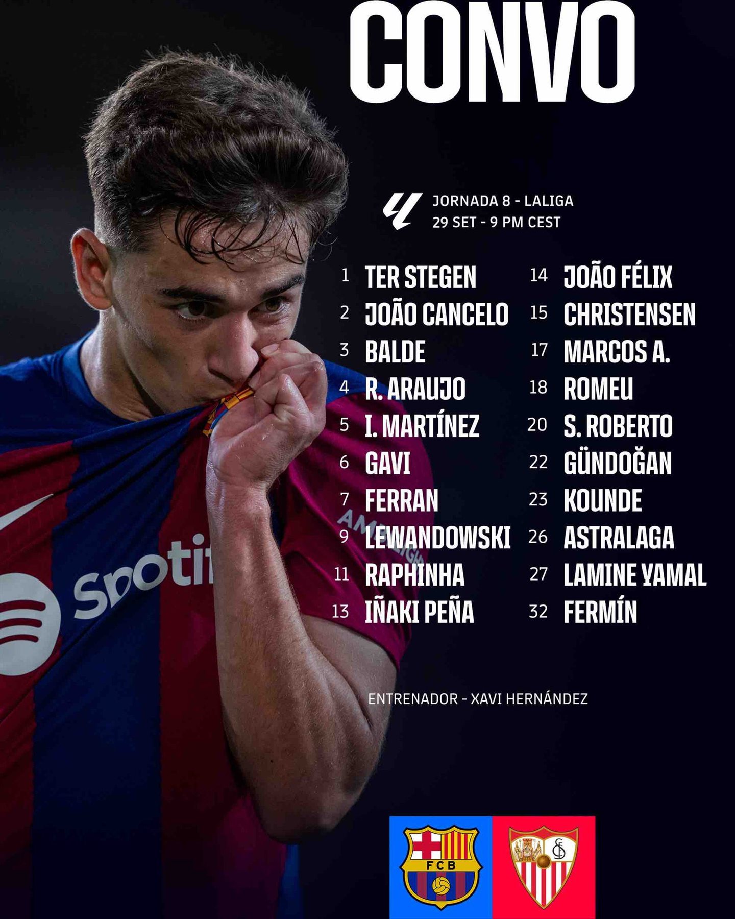 أعلن تشافي هيرنانديز المدير الفني لنادي برشلونة، قائمة لاعبيه لمواجهة إشبيلية المرتقبة ضمن منافسات الدوري الإسباني.