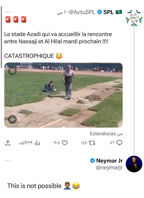 علق النجم البرازيلي نيمار دا سيلفا لاعب نادي الهلال السعودي، على سوء أرضية ملعب مباراة فريقه أمام نساجي مازاندران الإيراني في دوري أبطال آسيا.