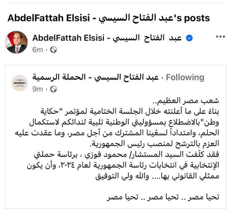 فقد كلّفت السيد المستشار محمود فوزي، برئاسة حملتي الإنتخابية في انتخابات رئاسة الجمهورية لعام 2024، وأن يكون ممثلي القانوني بها…. والله ولي التوفيق تحيا مصر.. تحيا مصر.. تحيا مصر".