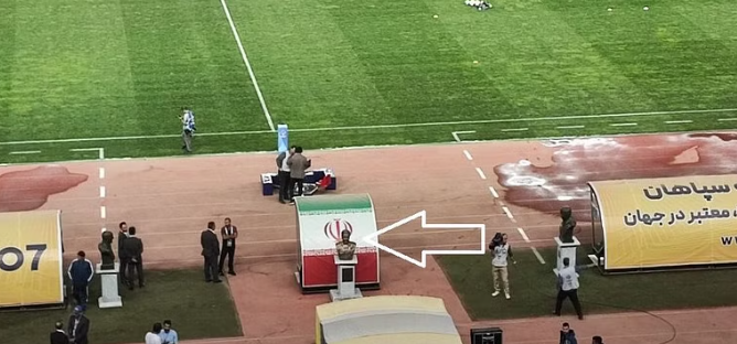 وأوضحت صور من الاستاد نشرت عبر وسائل التواصل الاجتماعي تمثالا نصفيا لقاسم سليماني، وُضع عند مدخل الملعب أمام اللاعبين عند خروجهم من النفق.