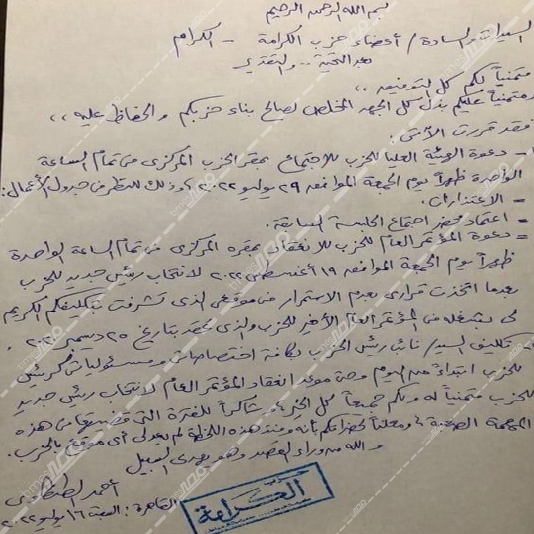وكان أعلن أحمد طنطاوي رئيس حزب الكرامة والبرلمان السابق استقالته من منصبه رئيسا للحزب، وتكليف نائب رئيس الحزب بإدارته لحين اجتماع المؤتمر العام الذي دعا لانعقاده خلال الفترة المقبلة، وجاء خطاب نص استقالة أحمد الطنطاوي الذي أشار فيه إلى اجتماع أعضاء المؤتمر العام للحزب يوم الجمعة نهاية الشهر الجاري يوليو، على أن يتم انتخاب الرئيس الجديد للحزب يوم 19 أغسطس المقبل.