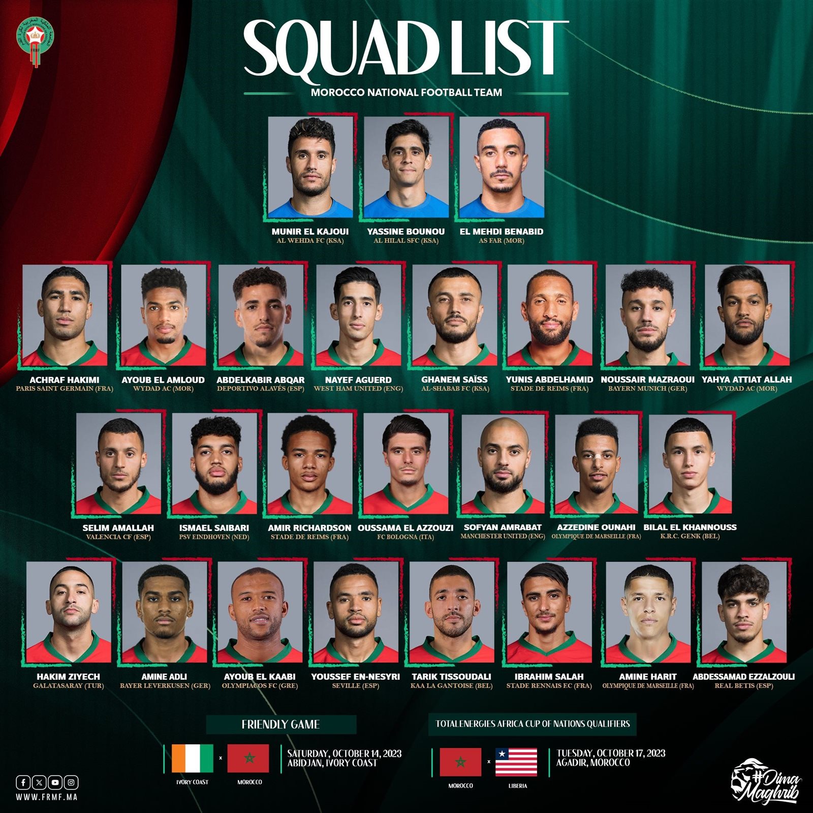 وعاد حكيم زياش وأيوب الكعبي وطارق تيسودالي إلى قائمة منتخب المغرب، كما تم استدعاء 6 من لاعبي المنتخب الأولمبي يتقدمهم إسماعيل الصيباري لاعب آيندهوفن.
