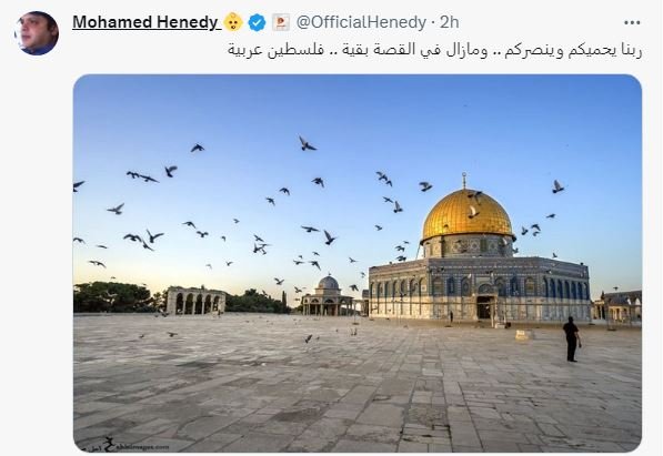ونشر محمد هنيدي صورة المسجد الأقصى عبر حسابه الرسمي على موقع تويتر.