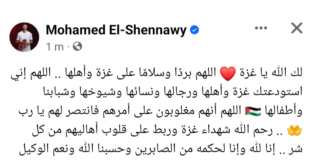 وجه الحارس محمد الشناوي قائد النادي الأهلي المصري، رسالة دعم إلى الشعب الفلسطيني خلال حربه الجارية ضد الاحتلال الإسرائيلي.