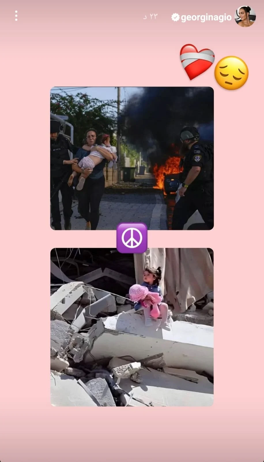 جاء ذلك بعدما دعمت جورجينا القضية الفلسطنية بعد اعمال العنف ضدهم من الاحتلال ونشرت جورجينا صور لاطفال فلسطين عبر خاصية الاستوري بحسابها الشخصي انستجرام، ووضعت ايموشن حزين.