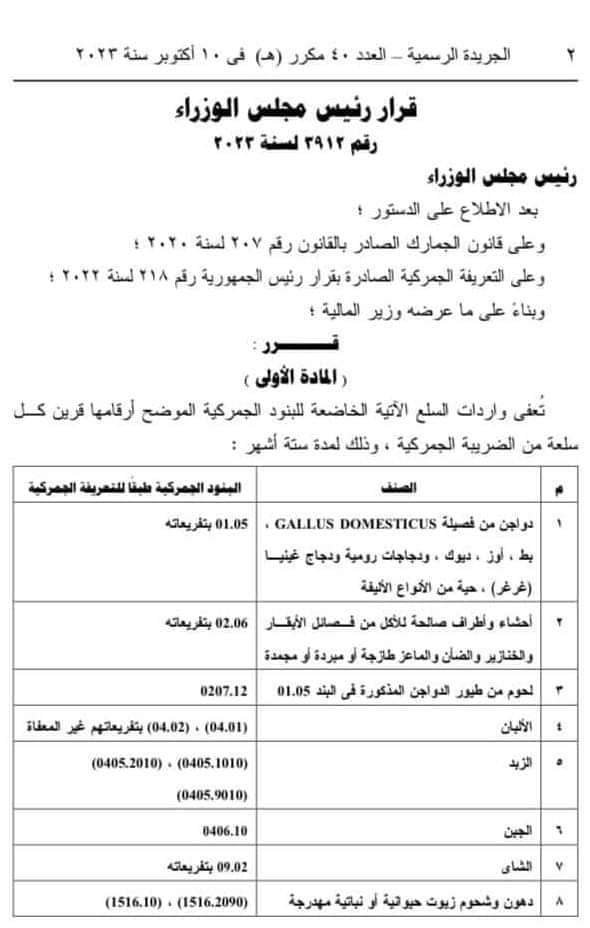 وجاء ضمن السلع: السكر والشاي والدواجن المجمدة والمعكرونة إضافة إلى الجبن والدهون والأدوية بكافة أنواعها، أحشاء وأطراف صالحة للأكل من الأبقار والخنازير والماعز، حسب ما نشرته الجريدة الرسمية.