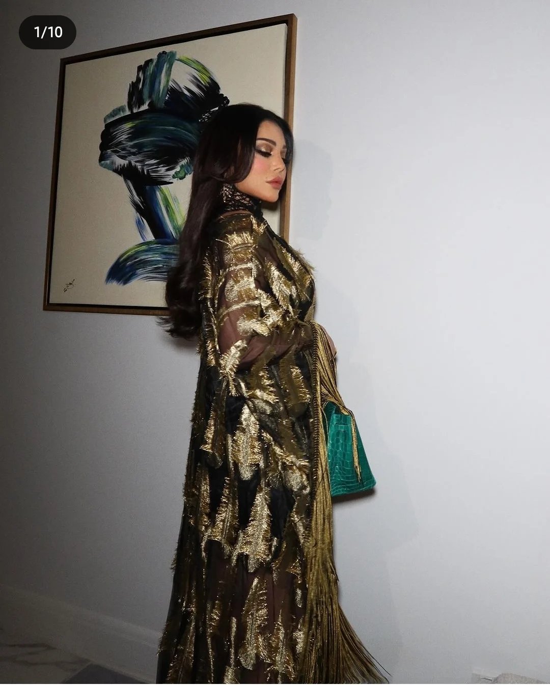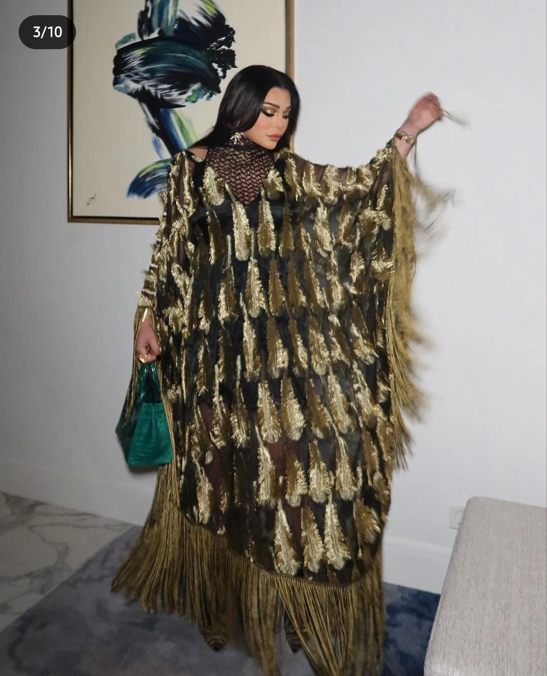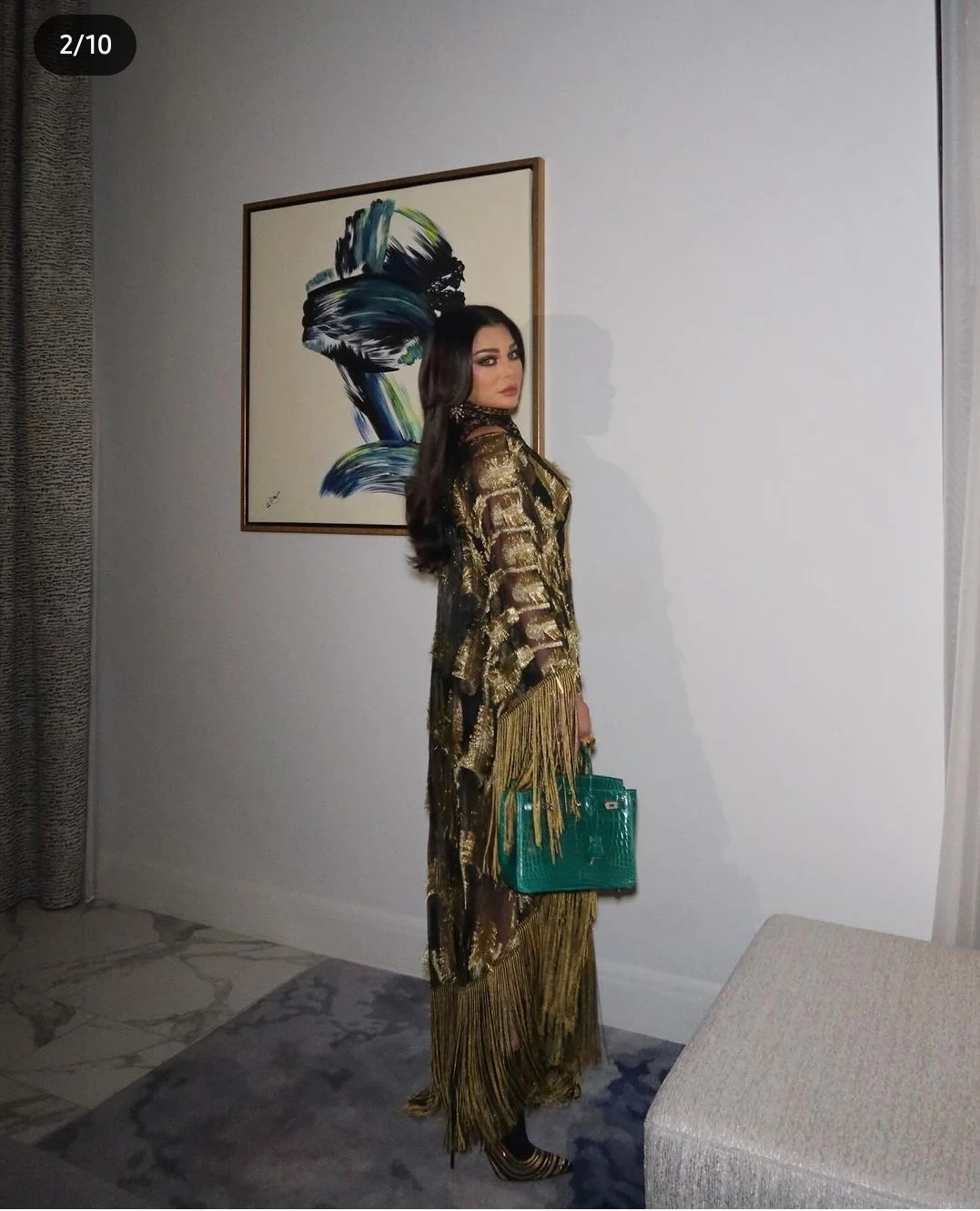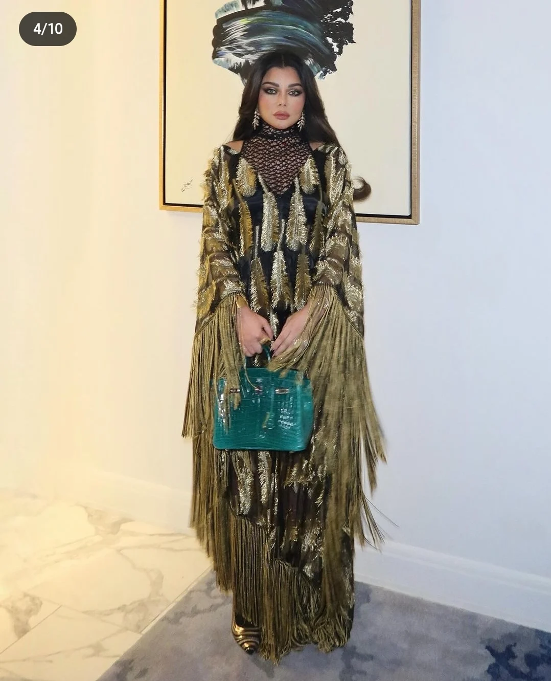 وظهرت هيفاء وهبي في الصور، وهي عباءة واسعة باللونين الأسود والذهبي وبأكمام طويلة تنتهي بشراشيب من نهايات الأكمام ونهايات العباءة، وقد اختارت حقيبة من الجلد اللامع باللون الأخضر القاتم.