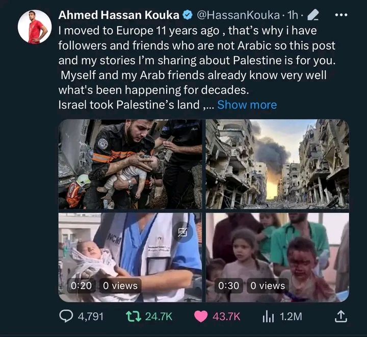 وكتب أحمد حسن كوكا، بيان شديد اللهجة موجه إلى أصدقائه من غير العرب، باللغة الإنجليزية، وجاء ذلك البيان بعد الأحداث المأساوية التي شهدتها فلسطين منذ يوم السبت الماضية بداية من عملية طوفان الأقصي، وصولًا إلى استخدام قوات جيش الاحتلال الإسرائيلي قنابل الفوسفور الأبيض المحرم استخدامها دوليًا.
