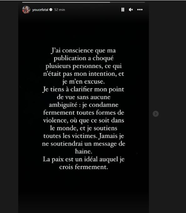 وأضاف: "أود أن أوضح وجهة نظري دون أي غموض، إنني أدين بشدة جميع أشكال العنف، في أي مكان في العالم، وأدعم جميع الضحايا، لن أدعم أبدًا رسالة الكراهية، السلام هو المثل الأعلى الذى أؤمن به بشدة".