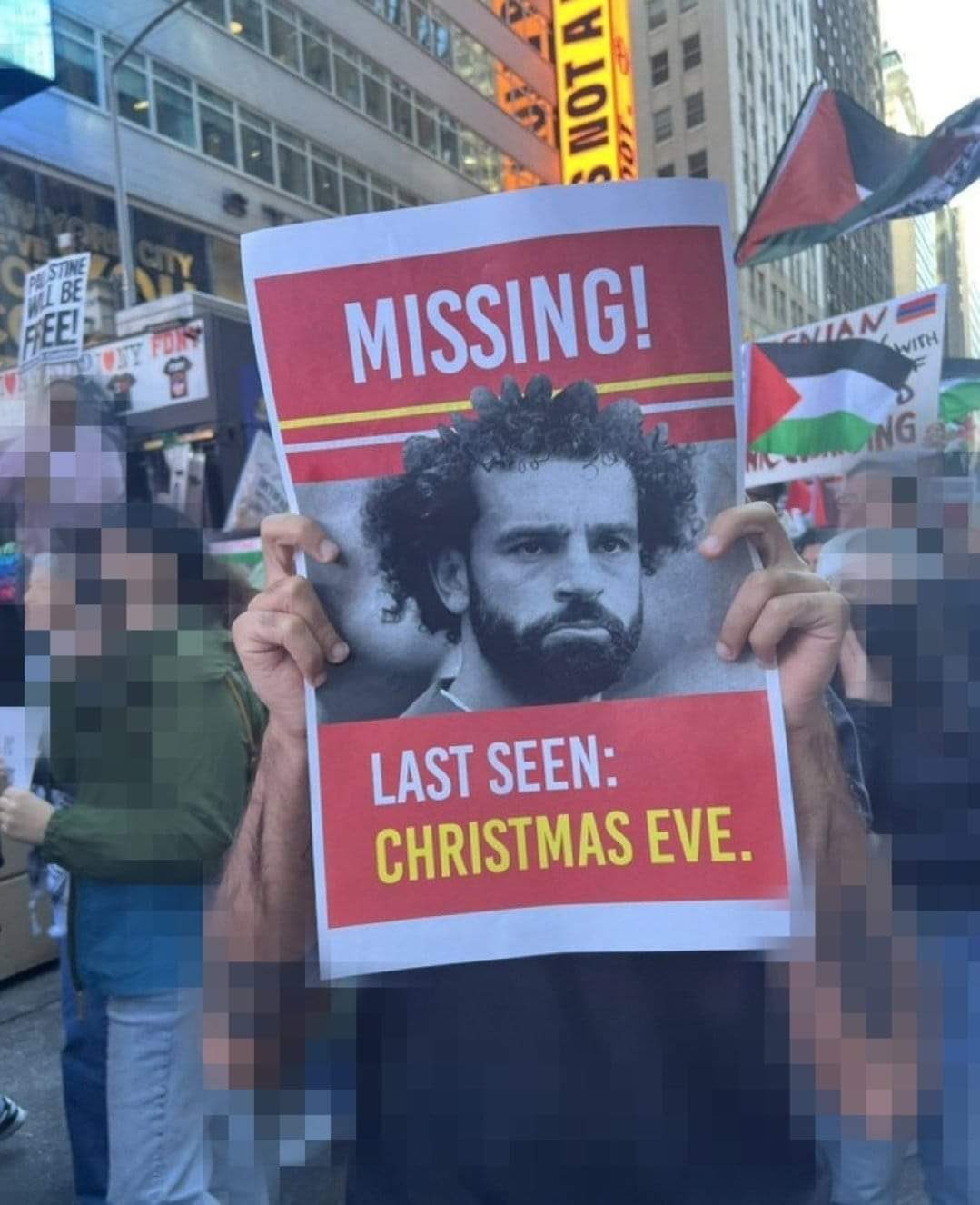 ورفع أحد المتظاهرين لافتة تنتقد صمت محمد صلاح، وعلق عليها: "مفقود، أخر ظهور له في الكريسماس".
