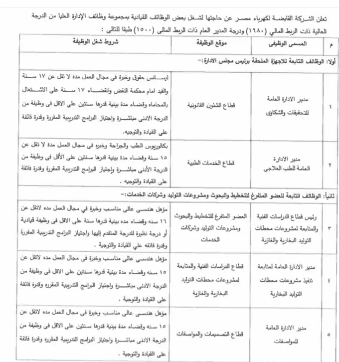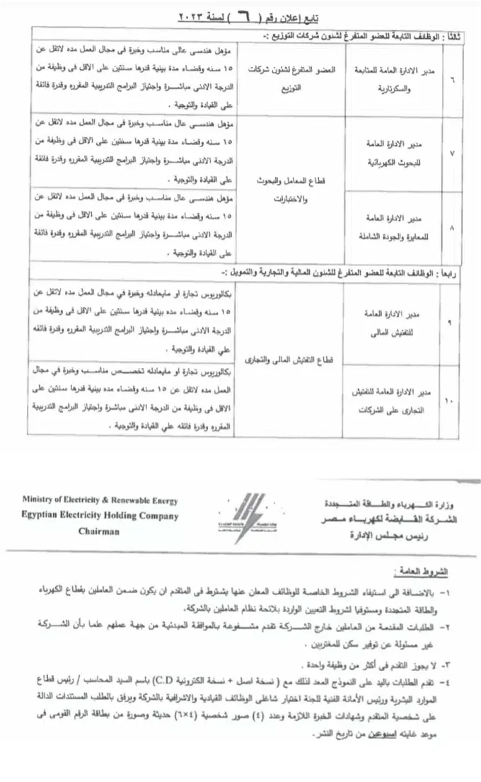 وأوضح الإعلان توافر ثمانِ وظائف خالية في قطاع الكهرباء، وظيفتين ملحقتين بالأجهزة الملحقة برئيس مجلس الإدارة ويكون المتقدمين من خريجى الطب والحقوق وخبرة لاتقل عن 15 سنة، و3 وظائف تابعة للعضو المتفرغ للتخطيط والبحوث ومشروعات التوليد ويشترط إن يكونوا من خريجى الهندسة بخبرة لاتقل عن 15 سنة، و3 وظائف تابعة للعضو المتفرغ لشركات التوزيع من خريجى كلية الهندسة تابعة للعضو المتفرغ للشئون المالية والتجارية من خريجى كلية التجارة وخبرة لاتقل عن 15 سنة.