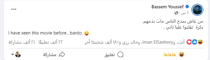 أول تعليق من باسم يوسف بعد مدح المصريين والعرب له