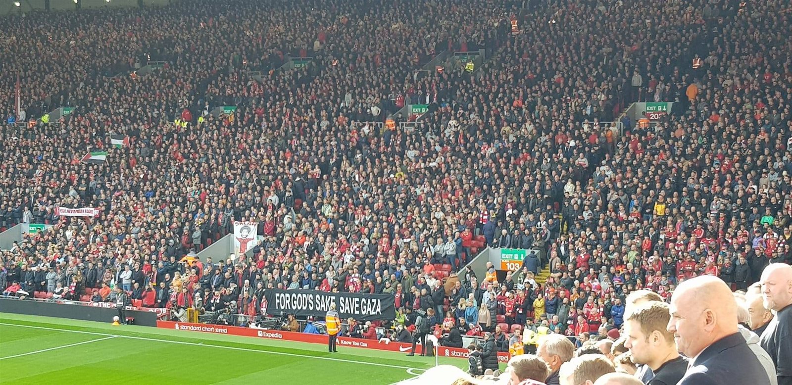 ويحل إيفرتون ضيفا على ليفربول في المباراة التي يستضيفها ملعب "أنفيلد"، بافتتاح منافسات الجولة التاسعة من "البريميرليج"، ورفعت جماهير ليفربول في مدرجات "إنفيلد"، لافتة كتبوا عليها: "من أجل الله، انقذوا غزة".
