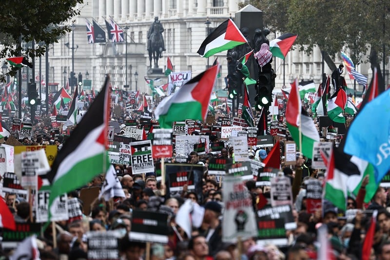 وقدرت الشرطة الإنجليزية عدد المشاركين في المظاهرة، التي رفعت شعار (المسيرة الوطنية من أجل فلسطين) ونظمتها حملة التضامن مع فلسطين، بنحو 100 ألف شخص.