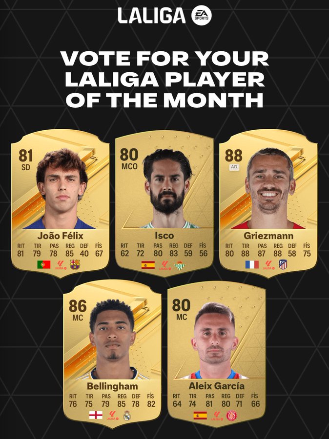 ويتنافس النجم الإنجليزي جود بيلينجهام لاعب ريال مدريد، مع الفرنسي أنطوان جريزمان لاعب أتليتكو مدريد، والبرتغالي جواو فيليكس نجم برشلونة، على جائزة أفضل لاعب في الدوري الإسباني خلال شهر أكتوبر.