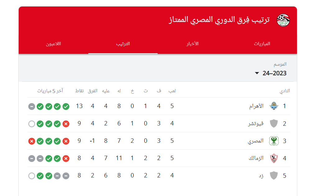 جدول ترتيب مسابقة الدورى المصرى الممتاز "دورى نايل" 2023_ 2024