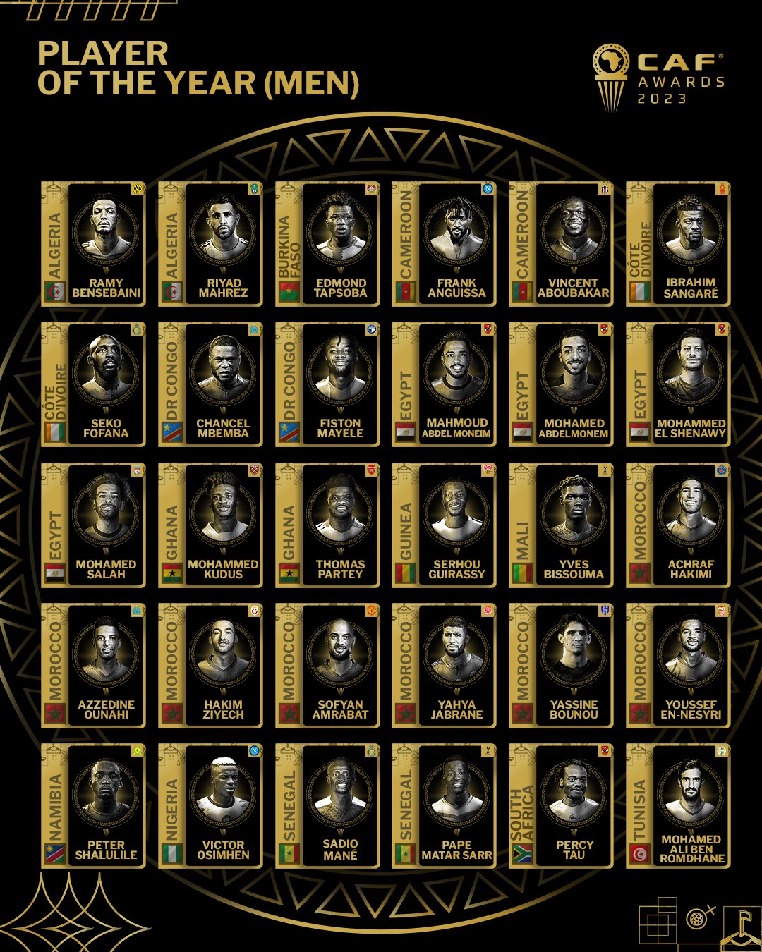وشهدت القائمة التي ضمت 30 لاعبًا ظهور النجم المصري محمد صلاح لاعب نادي ليفربول الإنجليزي، على رأس قائمة المرشحين لحصد جائزة أفضل لاعب إفريقي 2023.