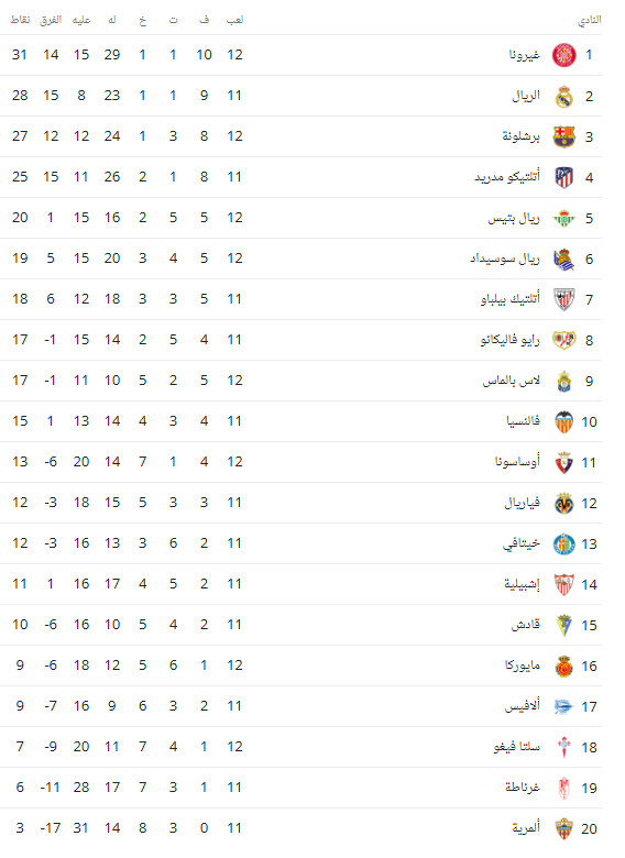 ورفع جيرونا رصيده إلى 31 نقطة فى صدارة ترتيب الدورى الإسباني جمعها من 12 مباراة، بفارق 3 نقاط عن ريال مدريد الوصيف الذى سيلعب اليوم ضد رايو فاليكانو.
