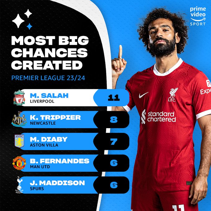 وأبرزت شبكة "برايم فيديو" الأوروبية الشهيرة، أرقام الفرص الكبيرة لأفضل اللاعبين في الدوري الإنجليزي والتي تصدرها الدولي المصري محمد صلاح خلال الموسم الحالي.