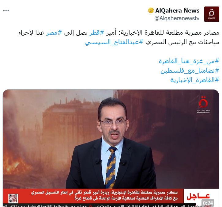 وتأتي زيارة أمير قطر في إطار التنسيق المصري مع كل الأطراف المعنية لمعالجة الأزمة الراهنة في قطاع غزة؛ حسبما أوردت القناة في نبأ عاجل.