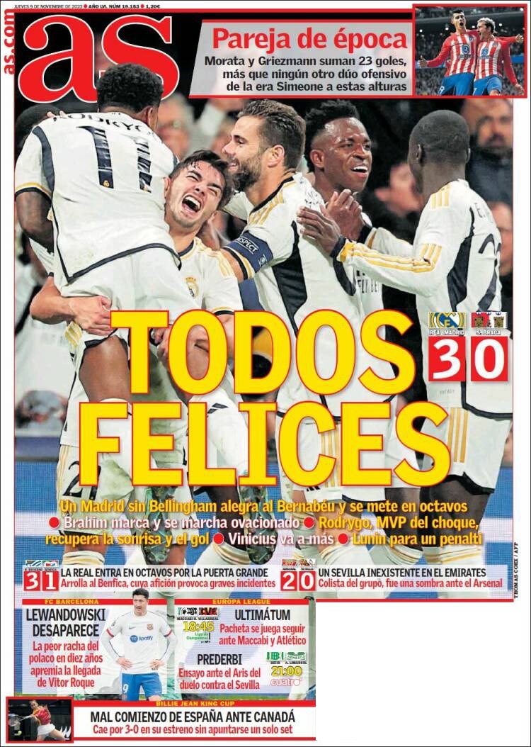 صحيفة ماركا قالت إن ريال مدريد يبدو فريدًا من نوعه ولا يوجد له مثيل في دوري أبطال أوروبا، حيث عزّز رقمه القياسي بتجاوز دور المجموعات للمرة الـ32 في 32 نسخة، وهو الفريق الوحيد الذي حصد هذا الإعجاز في تاريخ البطولة، أما آس فكتبت أن الكل يشعر بالسعادة داخل قلعة الملكي.