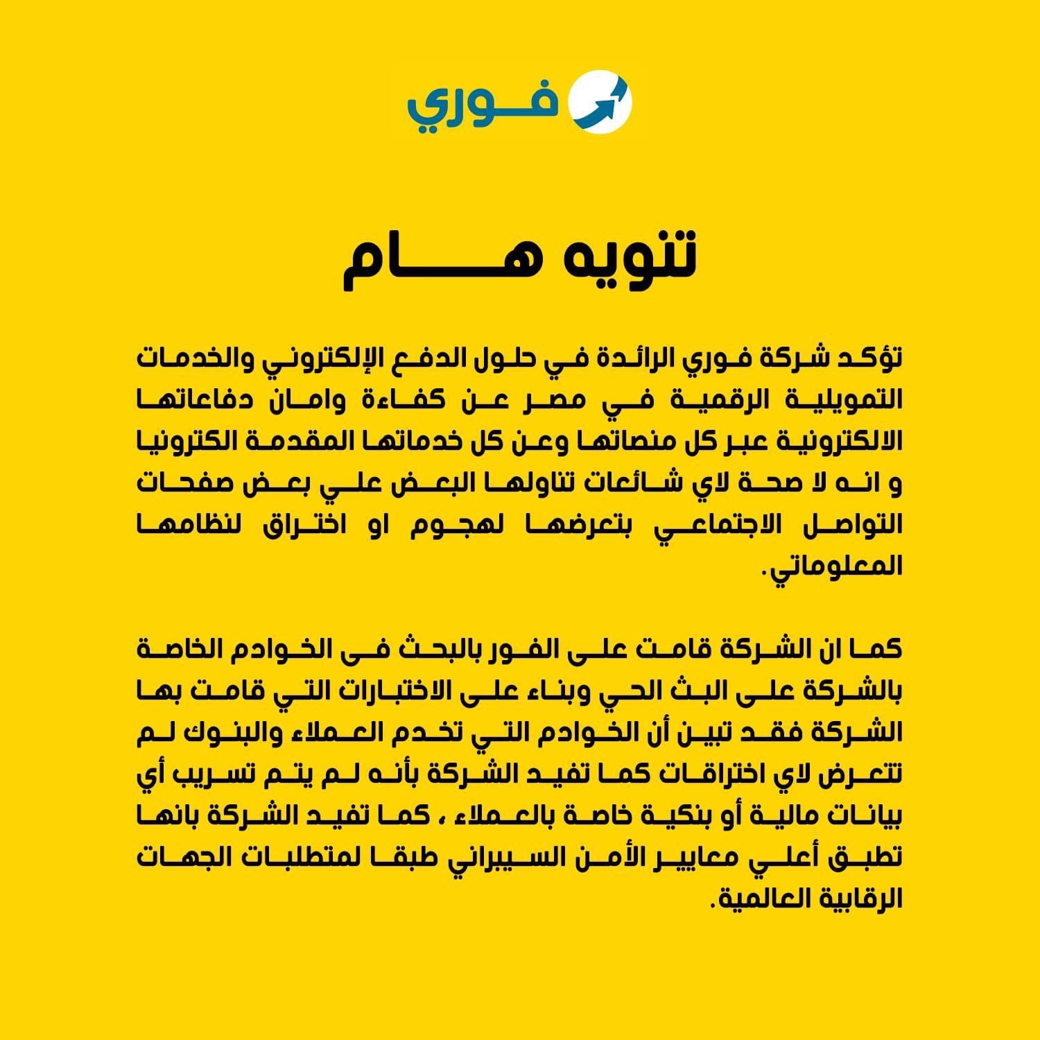 أكدت شركة فوري المتخصصة في حلول الدفع الإلكتروني والخدمات التمويلية الرقمية في مصر، كفاءة وأمان دفاعاتها الإلكترونية عبر كل منصاتها وعن كل خدماتها المقدمة الكترونيا، وأنه لا صحة لاي شائعات تناولها البعض علي بعض صفحات التواصل الاجتماعي بتعرضها لهجوم أو اختراق لنظامها المعلوماتي.
