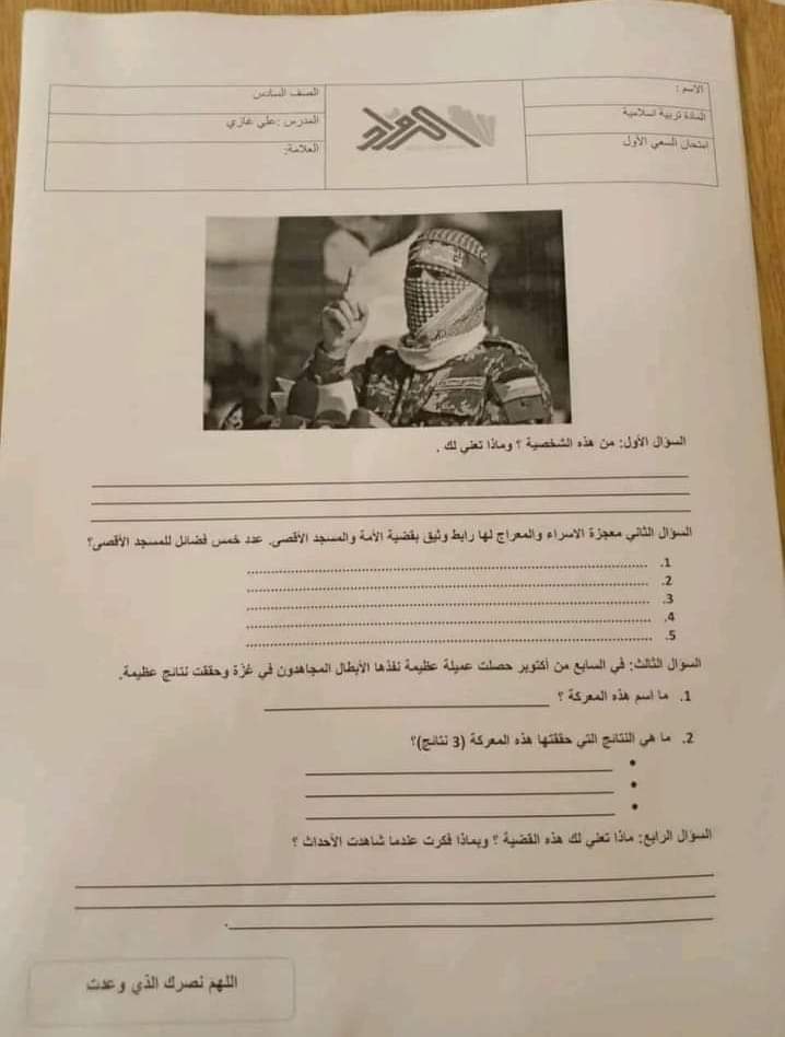 أسئلة عن طوفان الأقصى.. "أبو عبيدة" على ورقة امتحان بمدرسة في لبنان