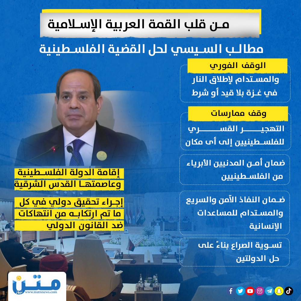 من قلب القمة العربية الإسلامية.. مطالب السيسي لحل القضية الفلسطينية (انفوجراف)