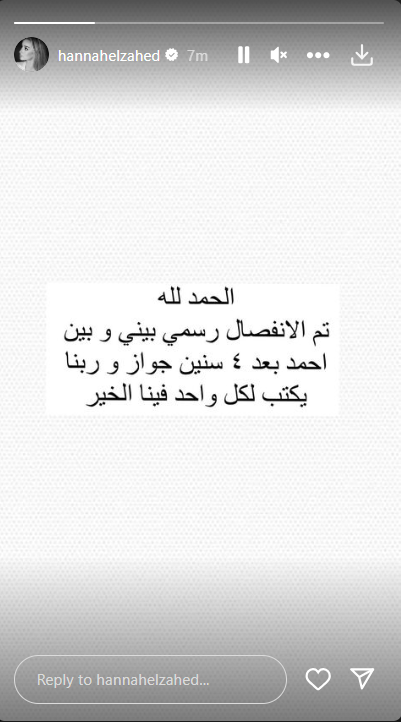 حيث كتبت على استورى حسابها بموقع إنستجرام: "الحمد لله تم الانفصال بينى وبين أحمد بعد 4 سنوات زواج وربنا يكتب لكل واحد فينا الخير".