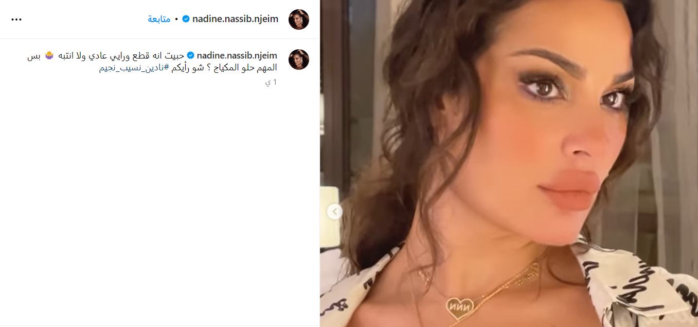 ونشرت نادين نجيم فيديو وصورًا عبر حسابها في إنستجرام، وظهرت فيها وهي تستعرض جمالها ومكياجها الذي وضعته بنفسها، وبدت في الفيديو مختلفة وجذابة.